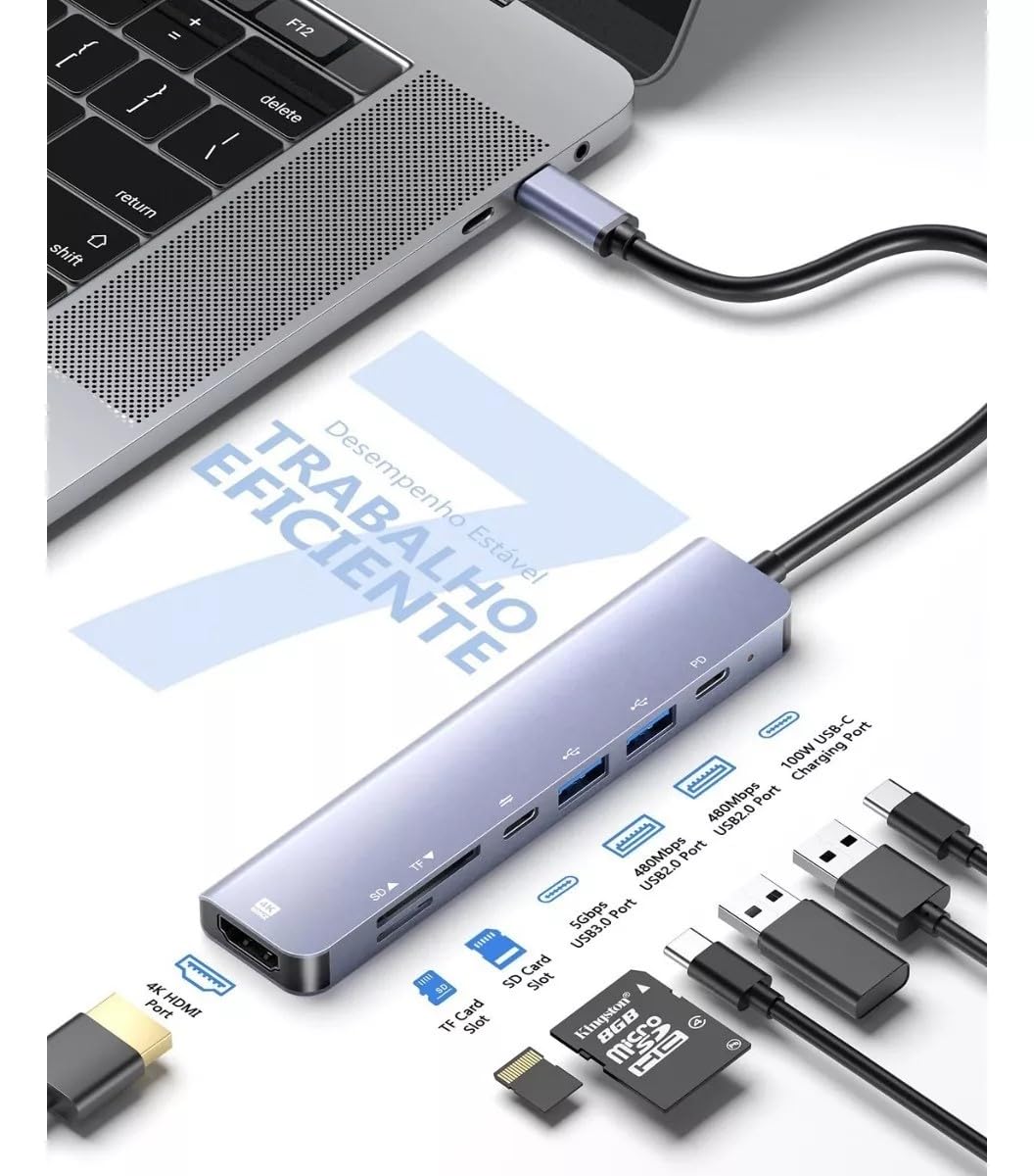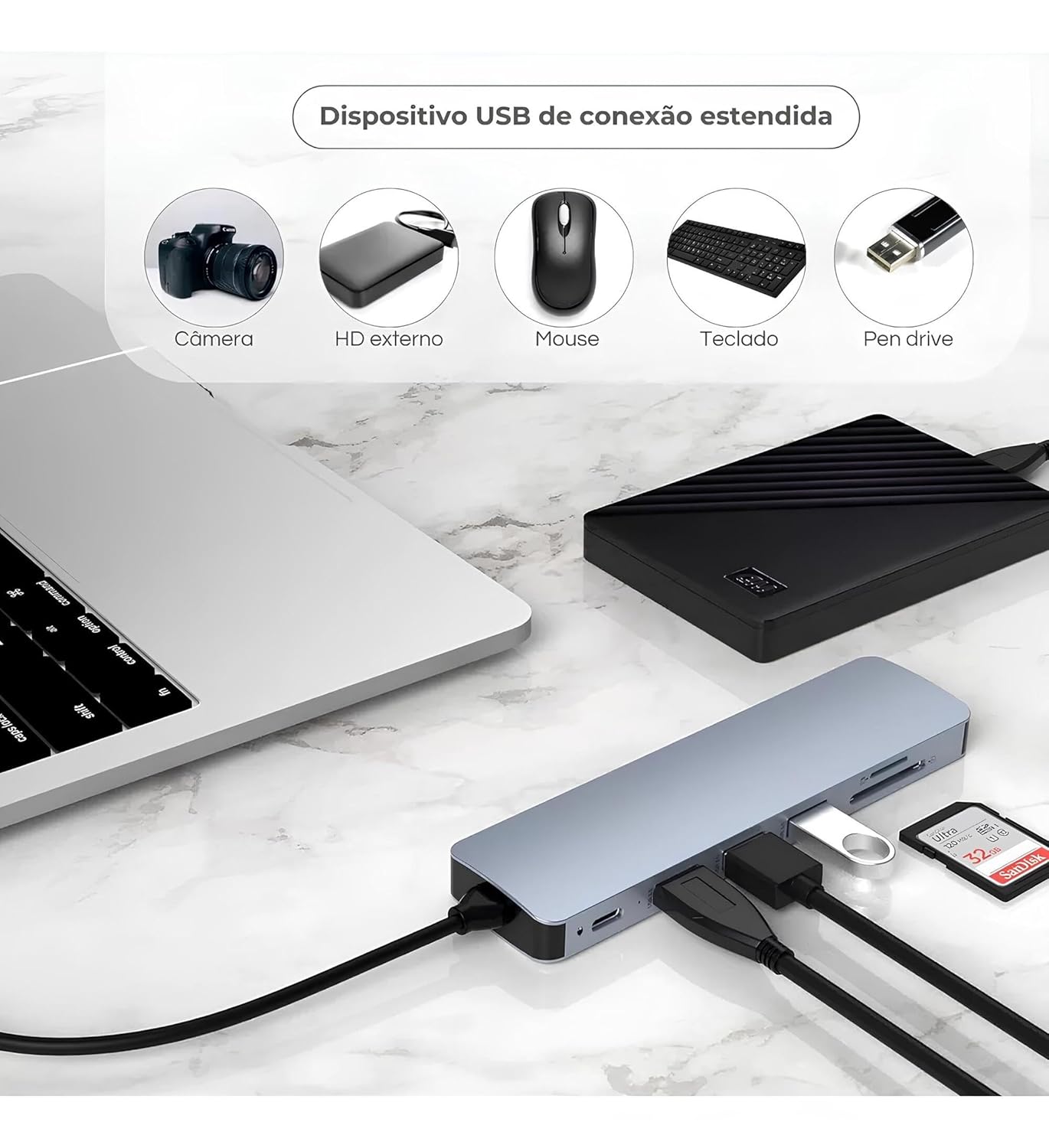 - 7 portas multifuncionais: Expanda as capacidades do seu dispositivo com portas USB 3.0, HDMI 4K, entradas para cartões SD/MicroSD e porta PD de 100W.